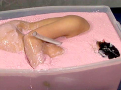 1回目の失敗を活かし、今回は体を寝かせて全身均等投入。Alginateの量を倍増させ、頭から足先まで一気に沈没! 液体が耳の中まで入り込み、鼓膜に響くグチュグチュ音が臨場感抜群。Tシャツは完全に溶けそうなほど透け、乳房全体が緑の膜で包まれ、固まる過程で乳首が引っ張られるような締め付けエロス。ショーツ内側まで液体が侵入し、クリトリス周りがプニプニ固まる感触に「んんっ! そこダメぇ…変な感じ!」と悶え声。彼女のリアクションが一段と激しくなり、目を見開いてパニック顔。固化が進むと体が石膏像みたいにカチカチに。無力感MAXで、指一本動かせず、息チューブの先で必死にハァハァする姿がフェチ心をくすぐる。羞恥ポイントは、固まった股間をスタッフが叩く音と、それに反応してビクンッと跳ねる下半身。興奮の証拠に、剥がした後のショーツに染みが…! ヌキどころはここ、絶望的な固まり具合と、解放後の放心顔のギャップ。