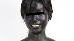 顔全体塗りへ移行。スティックファンデを顔中に塗りたくると、黒い膜が一気に広がり、白目だけが浮き出る「逆パンダ」状態に! 細部は綿棒で丁寧に。鼻の穴周り、瞼の端、頰の毛穴まで黒く埋め尽くされ、ファンデのべっとり感が顔全体を重く覆う。素人ちゃんの反応は羞恥MAXで、「顔真っ黒…もう人間じゃないみたい。熱くなってきちゃった」と頰を黒く染めながら喘ぎ声混じり。塗ってる最中、ファンデの油分が汗と混ざって「ヌルヌル」滑り、額から鼻へ滴る黒液がエロすぎ。完成した顔は完璧なブラックフェイスで、笑うと黒い皹がパックリ割れて内部の肌がチラ見えする透け具合が絶妙なヌキどころだ。