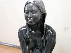 次に上半身集中攻撃。スタッフがスポンジでブラックペイントを塗りたくり、肩から腕、脇腹までねっとりマッサージ風に。りこちゃんの白い肌が徐々に黒く侵食されていく様子は、汚れの進行度が視覚的に最高潮。Eカップおっぱいを鷲掴みにされ、塗料を揉み込まれると、「あんっ、乳首敏感すぎる…黒くなって感じちゃう!」と本気で喘ぎ出す。ヌキどころNo.1はここ、黒い塗料が乳房に厚く塗られ、指の跡が残るべっとり感がヤバい。透けの名残で、塗料の下にピンクの乳首がチラチラ見え隠れし、興奮MAX。彼女の反応は羞恥から快楽へシフトし、目を潤ませて「もっと塗って…汚れたい」と懇願モードに突入だ。