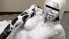 本編のBlack Paintingが始まると、事前のシャワーシーンで全身びしょ濡れに。白いタンクトップが肌にピッタリ張り付き、ピンク色の乳輪まで完全透け透け状態に! 水滴が滴るEカップの谷間を指でなぞりながら、「冷たい…あっ、乳首立っちゃう」と喘ぐりこちゃんの声がたまらない。そこへ大量のブラックペイントが投入され、最初はバケツから頭頂部にドバーッ! 黒い粘液が顔面を覆い、目元や唇周りにべっとり絡みつく。髪は一瞬で真っ黒の塊になり、滴り落ちる塗料が首筋を伝って胸元へ。タンクトップは即座に黒く染まり、透けていた肌がさらにエロく強調され、乳首の突起が黒い布地越しにくっきり浮かぶ。りこちゃんは「うわっ、目に入っちゃう! 苦しい…でもなんか変な感じ」と咳き込みながらも、体をくねらせて塗料を広げる。その羞恥の表情が、黒いマスクのような顔に白目だけが輝いて超シュールエロい。
