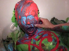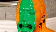 オープニングから一気に加速! いきなり赤い絵の具が顔面直撃。ドバッとぶっかけられた瞬間、彼女の目がカッと見開き、「えっ、うわっ! 冷たい!」と可愛らしい悲鳴を上げながら、頰を伝って顎までベットリ。赤が唇にまで絡みつき、息を荒げて拭おうとする手が逆に絵の具を広げてしまう。続いて青と黄色が交互に顔に降り注ぎ、瞬く間に虹色のマーブル模様に。まつ毛にまで青い塊が張り付き、視界を遮る中、彼女は「見えないよぉ…恥ずかしい…」と頰を赤らめながらも、どこか興奮した吐息を漏らす。顔が完全に絵の具のキャンバス化し、口元から滴る混合色が首筋を伝って白Tシャツに染み込む透け具合がエロい! Tシャツの胸元が湿って乳首の形がくっきり浮き上がり、ピンクのブラまで透視状態。彼女の羞恥心がピークに達し、体をくねらせて逃げようとするが、容赦なく全身へシフト。