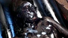 フィナーレは下に敷いた黒シートで全身グルグル巻き! 白ペンキボディをシートに転がし、ミイラみたいにタイトに巻き付ける過程で、シートがペンキを吸ってべっとり一体化。巻かれながら「動けない…熱い…興奮しちゃう!」と悶え、シート越しのボディラインが白く透け、乳と股間の膨らみが強調されて悶絶フィニッシュ。シート剥がしのアフターで剥がれ落ちるペンキ塊がエロすぎ、残った白垢肌の余韻が抜きどころの極み。この子の素人らしい純粋羞恥とどんどん加速する興奮リアクションが、白ペンキの清純汚辱感を倍増させて神作!