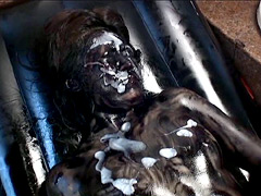 シーンはスタジオのビニールシート上でスタート。彼女は緊張した面持ちで墨汁の入ったバケツを前に立ち、スタッフの指示でまずはTシャツの上からドバドバと墨汁をぶっかけられる。黒い液体が胸元に落ちた瞬間、Tシャツは一気に透け透け状態に! 薄い生地が墨汁を吸い込み、乳首の形がくっきり浮き出るほどのびしょ濡れ透けっぷり。彼女の顔は真っ赤になり、「え、こんなに黒くなるの? ヤバい…」と小さな声で呟きながら、体をくねらせる羞恥リアクションが最高。墨汁は重力で滴り落ち、太ももまで黒い筋を描きながら伝う。油分で塗りにくい墨汁の性質上、肌に塗り広げようとすると白い部分がチラチラ見え隠れし、それが逆にエロいコントラストを生む。スタッフがブラシで塗り込むと、彼女の肌は徐々に均一な黒さに変わり、まるで全身が黒いラテックスに包まれたような光沢を帯びていく。