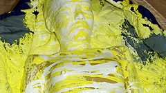 ここからの汚れのエロさが本作の真骨頂。Tシャツを脱がされ、上半身ヌードで墨汁を追加投入されると、乳房全体が黒くコーティング。乳首周りは特に厚く塗られ、黒い塊がぷるぷると揺れるたびにヌルヌルの光沢がカメラに反射してヤバい。彼女の反応は羞恥MAXで、「冷たい…でもなんか変な感じ…」と息を荒げ、手で隠そうとするがスタッフに阻まれ、観念して両手を広げる姿が興奮ポイント。ショーツにも墨汁が染み込み、パンツのクロッチ部分が黒く透けて陰毛のシルエットが浮かび上がる透け具合は、ヌキどころの筆頭。彼女自身もその感触に興奮を抑えきれず、太ももを擦り合わせながら「あっ、濡れてる…墨汁だけじゃないかも」と自覚しちゃう羞恥の呟きがエロすぎる。
