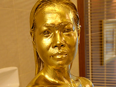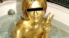 本編の本題、金粉塗布シーンが圧巻。スタッフの手でまずは脚からスタート。金粉ローションをスプーンですくって太ももに垂らし、ゆっくりマッサージ的に塗り広げていく。ヌルヌルとした金色の液体が肌に吸い付くように広がり、すぐにべっとりとした膜を形成。光を当てると、微妙な角度でピンクゴールドから深みのあるマットゴールドまで色合いが変化し、透け具合が絶妙。素肌の血管や産毛までぼんやり透けて見える半透明感がエロく、汚れの粘着力が半端ない。彼女の反応は最高で、脚を塗られながら「冷たくて気持ちいい…でもベタベタして恥ずかしい!」と頰を赤らめ、足をモジモジくねらせる。太ももの内側まで塗布されると、膝を寄せて隠そうとする仕草が可愛く、興奮で息が少し荒くなる。