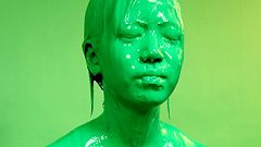 オープニングから、素人女子の緊張した表情がカメラに捉えられる。20代前半と思しきスレンダー体型の彼女は、薄手の白いタンクトップとショーツ姿で登場。肌はツルツルで、すでに軽くオイルを塗布されているのか、照明の下で艶やかに輝いている。スタッフの手によって、金粉の塗布がスタート。まずは足の指先から。金色の液体が足首を伝い、ふくらはぎへ。彼女の足は細く華奢で、金粉が肌に密着する様子がアップで映し出される。最初は「冷たい…」と小さく呟きながら体をくねらせるが、金粉のベタつきが強まるにつれ、足裏全体が金色にコーティングされていく。指の間まで丁寧に塗り込まれ、動くたびに金粉が糸を引き、ヌルヌルとした光沢がエロい。彼女の反応は初々しく、足を上げて確認する仕草で羞恥心がにじみ出る。「こんなにベタベタ…恥ずかしい」と頰を赤らめ、カメラをチラ見しながらも、徐々に金粉の感触に慣れていく様子がたまらない。