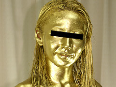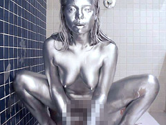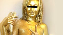 クライマックスは頭部! 髪を金色に刷毛で梳くように塗り、耳たぶや頰、唇周りまで黄金マスク化。髪が重くウェットになり、顔全体がテカる完成形はまさに黄金女神。「自分で見ると変態みたい…でもなんか興奮する」と鏡を見てクスクス笑う彼女の表情が最高。全身金粉のべっとり具合は完璧で、動くたび金粉が肌同士で擦れてクチュクチュ音が響く。