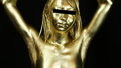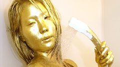 フィナーレは顔塗り! 目を閉じ、口を軽く開かせて金粉を刷り込む。頰から顎へ、鼻筋、額まで丁寧に。まつ毛まで金色に輝き、唇の輪郭が金粉で強調される完成度の高さは圧巻。顔全体がブロンズ像さながらのキンキラ質感で、素顔の可愛さが金粉の膜越しに透け、瞳の黒目が妖しく光るエロさ。最後の「私、金ピカ人間になっちゃった…」という照れ笑いが、羞恥と達成感のミックスで締めくくり。全身金粉の汚れ具合は均一で剥がれにくく、ポーズを取るたびに光が反射してヌキどころ連発。素人ならではの自然なリアクションが、金粉の重厚なエロスを倍増させている。