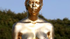袋から解放されると、彼女はすでに半分メタリックボディの銀色美女に変貌。息を荒げながら「体中が銀でピカピカ…恥ずかしいのに、熱くなっちゃう…」と告白し、観客の視線を意識した羞恥プレイが炸裂。スタッフが「次は金粉で本気モード!」と、全身に金粉スプレーを吹きかけ、さらに粉状の金粉と銅粉をジャブジャブ振りかける。金粉は細かい粒子で肌に吸い付き、銅粉の赤みがかった輝きが混ざって宝石のような多層メッシー肌に。彼女の白い肌が完全に金属塗装されたみたいになり、光の反射でヌルリとしたウェット感が強調される。ここで再び圧縮袋イン! 今度は金粉&銅粉が大量に混ざった状態で空気抜き。袋内圧力が粉を体に押し込み、股間周りが特に厚くコーティングされ、ショーツが金粉でパンパンに膨張。「ううっ、息が…金粉が口の中まで入ってきてる…でもクリが擦れてヤバい…!」と悶絶リアクションが連発。粉の粒子が摩擦で熱を帯び、ヌルヌル溶け出すような汚れ具合が神。胸は金粉の重みで谷間に溜まり、圧縮で乳房が潰されながらもハリ感を保ち、銅粉のアクセントが乳輪を強調して超エロ透け。