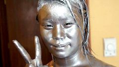 オープニングはシンプルな白背景のスタジオ。ニャちゃんは全裸に薄いサロペー風のミャンマー伝統布を腰に巻いただけのミニマル衣装で登場。布は半透明で、すでに微かな肌の透けがチラ見えし、期待値を一気に上げる。スタッフが金粉パレットを手に近づくと、ニャちゃんは目を輝かせて「わあ、キラキラ!」と興奮気味。最初は指先で慎重に金粉を頰や首筋に塗り広げていくが、すぐに大胆に。金粉の粘度が高く、トロリとしたメタリックゴールドが肌に密着し、瞬時に鏡面のような光沢を生み出す。頰から鎖骨へ、胸の谷間へ…塗布直後の濡れたようなテカリがエロすぎ! 乳首周りは特に丁寧に、ピンクの先端を金粉でコーティング。ニャちゃんの乳首が金粉の下で微かに透け、硬く尖るのが分かる瞬間、股間が疼く視聴者は続出間違いなし。