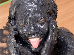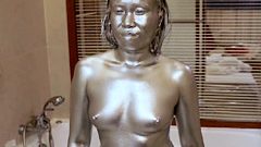 徐々に銀粉の量を増やし、首筋からデコルテへ。銀の雫が鎖骨を伝い、バストの谷間に溜まってプルプル揺れる。ニャちゃんの反応が最高潮に! 「あっ、くすぐったい…はうっ!」と体をよじりながらも、目はトロンとして快楽に浸ってる。スタッフがタンクトップを捲り上げると、すでに半分銀まみれの乳房が露わに。銀粉が乳首に直撃し、塗り広げられるたび「んんっ! そこ、敏感…」と甘い喘ぎ。金粉の残渣と銀粉が混ざり、肌に独特のレイヤード輝きを生み、汚れのエロさが爆発。乳房全体が鏡面のように光り、指で撫でるだけで銀の糸を引き、べっとりとした粘着音が響く。彼女の羞恥心が羞恥プレイを加速させ、頰を赤らめながら「みんなに見られてる…興奮しちゃう」と囁く姿に、視聴者の股間が熱くなること間違いなし。