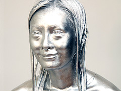 次は大胆にタンクトップを捲り上げ、素肌直撃の銀ペイント攻撃。未来ちゃんのCカップ美乳が露わになり、スタッフのブラシが乳首をグリグリ塗り込むシーンはヌキどころの筆頭! 銀色のペイントが乳頭をコーティングし、光沢たっぷりにテカテカ輝く。未来ちゃん「んっ、あっ、そこ敏感なんです…はうっ!」と本気で喘ぎ、顔を赤らめて目を潤ませる。羞恥と快楽の狭間で悶える表情がリアルすぎ。白背景が銀の反射を増幅させ、まるで未来ちゃんの乳房が宝石みたいに輝いてる。汚れのエロさは格別で、ペイントが滴って腹部まで伝い、ヘソに溜まるプール状態が視姦欲を刺激しまくる。