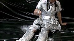 ここから本番のシルバーペイント祭り。スタッフの手が未来ちゃんの肩から滑り込ませ、銀色のドロドロペイントをドバドバ塗りたくる。最初は首筋から胸元へ。タンクトップの上から直塗りで、銀の液体が布地を染み抜け、透け乳房が銀色に輝き出す! 「うわっ、ヌルヌル滑る~! 止まらないよぉ」と未来ちゃんが悲鳴混じりの嬌声を上げ、体をよじるリアクションが最高に羞恥心くすぐる。ペイントの粘度が高く、糸を引きながら胸の谷間に溜まる様子が卑猥。AVモデルだけあって、恥ずかしがりつつも腰をクネらせて誘うようなポーズを取るから興奮度MAX。