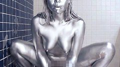 徐々にペイントの勢いが加速。金粉ローションを両手にたっぷりすくい、彼女のTシャツをまくり上げて素肌にダイレクト塗布。腹部からへそ周りへ、べっとりと金色の膜が張り付き、汗と混じってヌルヌル滑る感触がカメラにバッチリ捉えられる。彼女の反応は本物で、「イヤ! ベタベタ!(嫌、ベタベタ!)」と笑い混じりの悲鳴を上げつつ、指先が金粉で滑って自分の乳房を無意識に揉みしだくハプニングが発生。金粉まみれの手が柔らかなおっぱいを包み込み、頂点の乳首が金色の光の中でピクピク硬く勃起していく様子は興奮ポイントの連続。透けフェチにはTシャツの裾から覗く金粉ボディのコントラストがエロすぎ、汚れのエロさは金粉の重厚な輝きが肌の凹凸を強調し、まるで黄金像のような神々しいのに下品なメッシー感が絶妙。