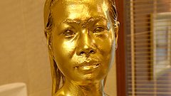 中盤のハイライトはボディ全体のメタリックコーティング完了後。衣装を脱がされず、そのまま全裸に近い状態でペイントを重ね塗り。背中側を塗るために四つん這いにさせられると、お尻の割れ目まで金色に侵食され、ヒップの丸みがメタリック光沢で強調されて超フェチい。彼女の興奮ポイントはここで明確に – 息が荒くなり、「熱い…体が熱くなってきた」と自ら股間を触り始め、ペイントまみれの指でクリトリスを弄るセルフプレイが炸裂! 透け衣装が剥がれ落ち、金色のヌルヌル肌同士が擦れ合う音がASMR級。最低限機材ゆえのラフなカメラワークが逆に臨場感を増し、男性目線で彼女の顔アップ→胸→股間のローリングショットがエロすぎる。