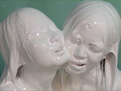 クライマックスは頭上からの大量投入! バケツいっぱいの白絵の具を交互にぶっかけられ、髪の毛から顔、首筋まで一瞬で真っ白に塗り潰される。Aちゃんの長い黒髪が白く変色し、重く垂れ下がって顔を覆う姿はまさに芸術。目元や唇に絵の具が張り付き、舌でペロリと舐め取る仕草が超エロい。Bちゃんは「うわぁ、全身白い! 私、何者!?」とパニックになりながらも、興奮で乳首をビンビンに勃起させて体をくねらせる。全身が白いキャンバスのように輝き、肌の曲線が絵の具の層で強調され、ヌルヌルの質感がカメラにアップで捉えられる。透け感はピークで、Tシャツが完全に溶けたように肌に密着し、乳輪の色までうっすら見える。汚れのエロさは格別で、2人が抱き合って体を擦り合わせると、絵の具が混ざって泡立つような音が響き、互いの体液と混じったような錯覚を起こす。